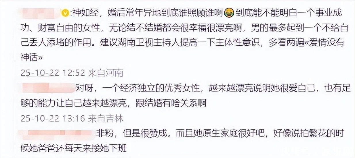 还有不少粉丝对唐嫣婚后把重心放在家庭上而不顾事业而不满,甚至希望她离开男人当“独立大女主”。