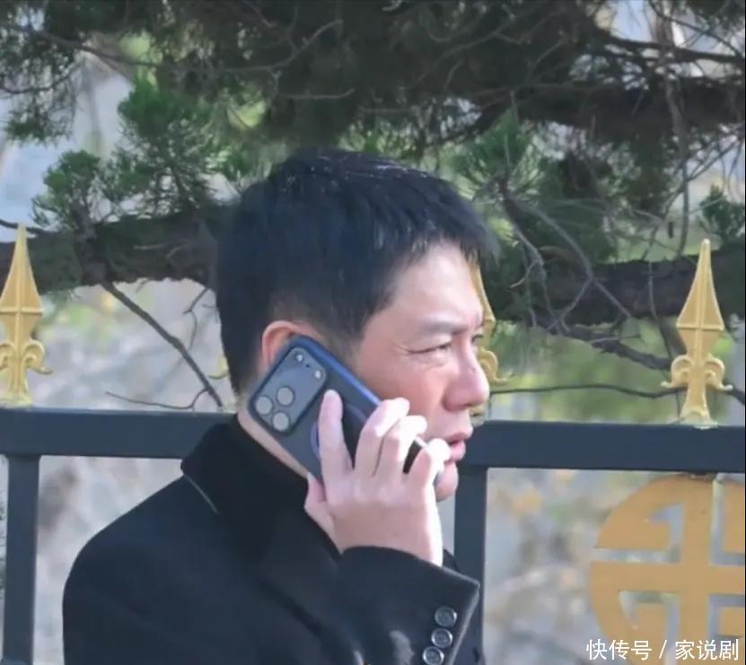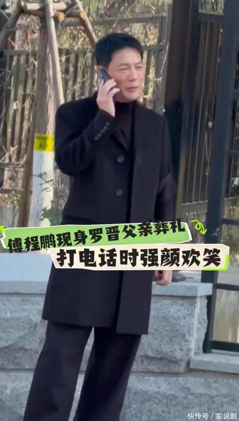 当天傅程鹏应讣告要求一身黑,胳膊上还戴着孝,在外面拿着最新款苹果手机打电话的时候笑容非常勉强。